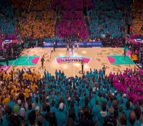 這是馬刺時(shí)隔7年再進(jìn)季后賽,球隊(duì)為現(xiàn)場(chǎng)球迷提供了不同顏色的加油T恤。興奮的球迷們套上T恤后,馬刺主場(chǎng)呈現(xiàn)出不同色塊組成的方陣,呼應(yīng)著今晚馬刺球場(chǎng)的配色,氣勢(shì)如虹。