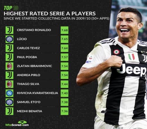 近期WhoScored公布的意甲高分榜單中,第一名是C羅,這個結(jié)果爭議不大。他在尤文圖斯的意甲數(shù)據(jù)非常扎實(shí):98場比賽貢獻(xiàn)81個進(jìn)球和15次助攻。憑借極強(qiáng)的終結(jié)能力和穩(wěn)定的輸出,他將平均評分拉到了7.68分,完全具備說服力。緊隨其后的盧西奧和特維斯同樣是依靠實(shí)打?qū)嵉谋憩F(xiàn)入圍的。文中原數(shù)據(jù)的盧西奧意甲126次出場有誤,實(shí)際上盧西奧在國際米蘭共出戰(zhàn)了96場意甲聯(lián)賽(各項(xiàng)賽事總計(jì)136場),他是球隊(duì)巔峰時期的后防絕對核心;特維斯效力尤文兩個賽季,意甲66場打進(jìn)39球,其中2014/15賽季單季轟入20球。這種對比賽的直接干預(yù)能力,在評分模型中很容易拿到高分。