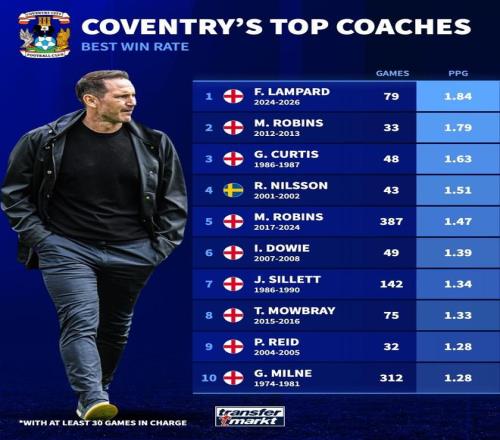 2024年11月,蘭帕德接手考文垂,帶隊(duì)從第17名打到第5名,止步升級(jí)附加賽半決賽。本賽季,蘭帕德帶隊(duì)高歌猛進(jìn),最終提前鎖定了英超席位。根據(jù)統(tǒng)計(jì),他的場(chǎng)均積分達(dá)到了1.84分,為隊(duì)史最高。