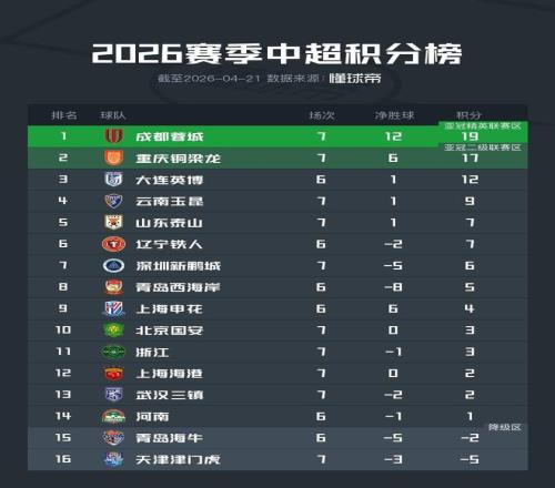 4月21日,中超第7輪先賽五場(chǎng)。川渝兩隊(duì)繼續(xù)領(lǐng)跑積分榜,山東泰山在客勝天津津門(mén)虎后升至第五,國(guó)安升至第10,浙江隊(duì)在一波四輪不勝后掉到了第11,三鎮(zhèn)則成功將積分轉(zhuǎn)正。