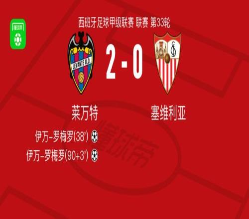 北京時(shí)間4月24日西班牙足球甲級聯(lián)賽 聯(lián)賽 第33輪,萊萬特主場對陣塞維利亞。萊萬特伊萬-羅梅羅梅開二度。最終比分萊萬特 2-0 塞維利亞。