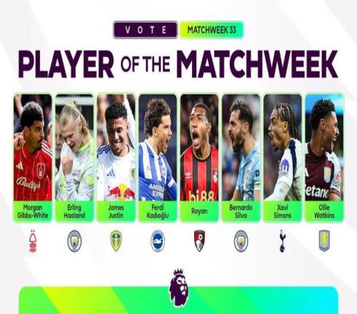 北京時間4月23日,英超官方公布了第33輪比賽最佳球員的候選名單,其中哈蘭德、B席、吉布斯-懷特、哈維-西蒙斯、沃特金斯等球員在列。