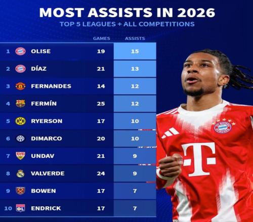 北京時(shí)間4月23日,德轉(zhuǎn)統(tǒng)計(jì)出了2026年歐洲五大聯(lián)賽+所有賽事助攻最多的10名球員,奧利塞以19場(chǎng)助攻15次的數(shù)據(jù)高居第一,他的隊(duì)友路易斯-迪亞斯13次助攻排名第二,布魯諾-費(fèi)爾南德斯12次排名第三。