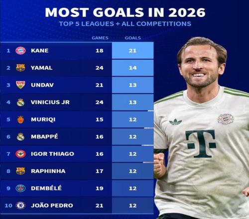北京時間4月23日,德轉(zhuǎn)統(tǒng)計出了2026年歐洲五大聯(lián)賽+所有賽事進(jìn)球最多的10名球員,哈里-凱恩以18場打進(jìn)21球的數(shù)據(jù)高居第一,亞馬爾14球排名第二。